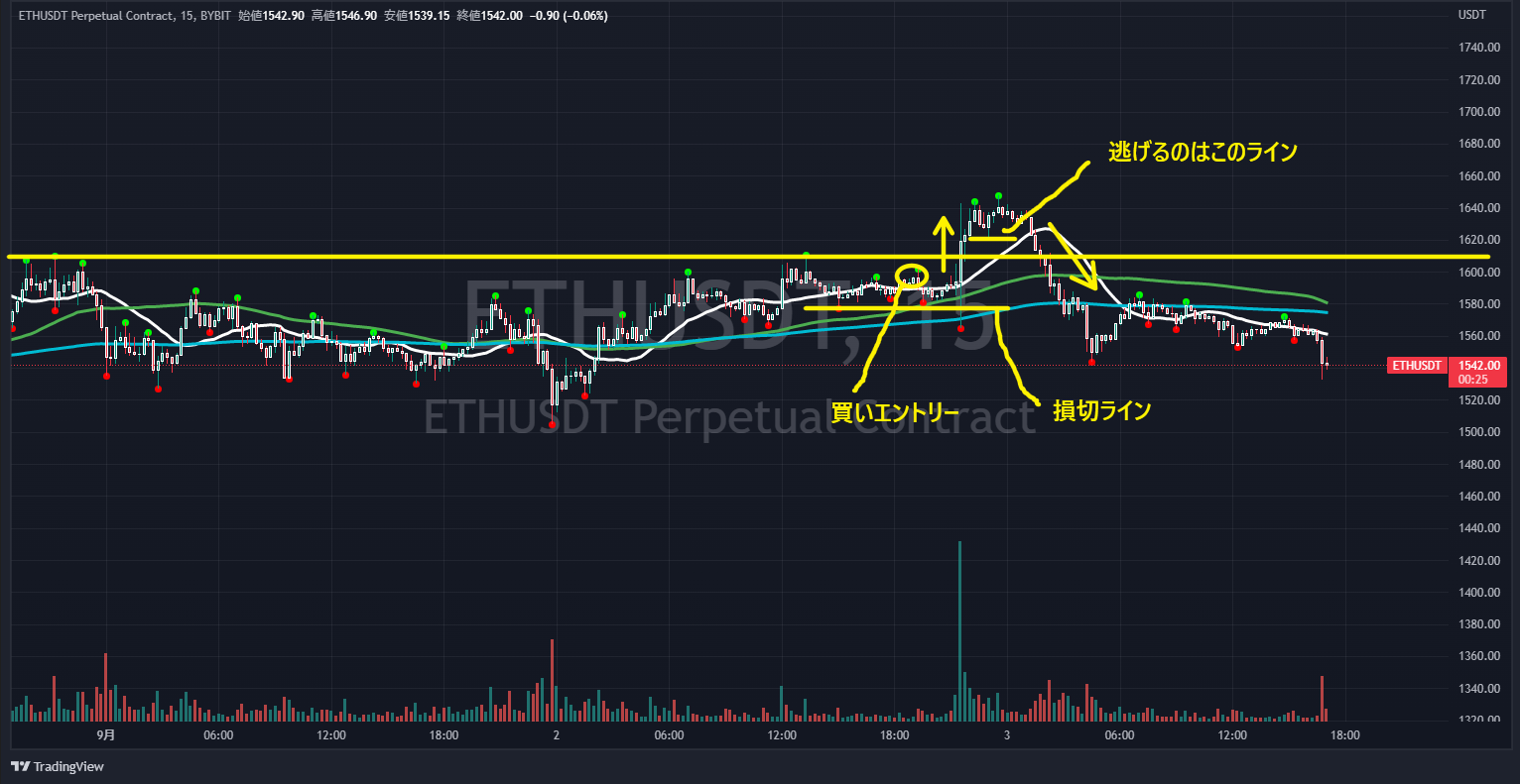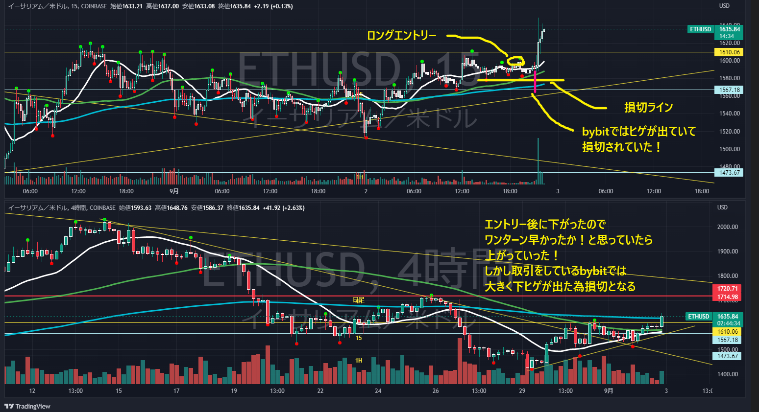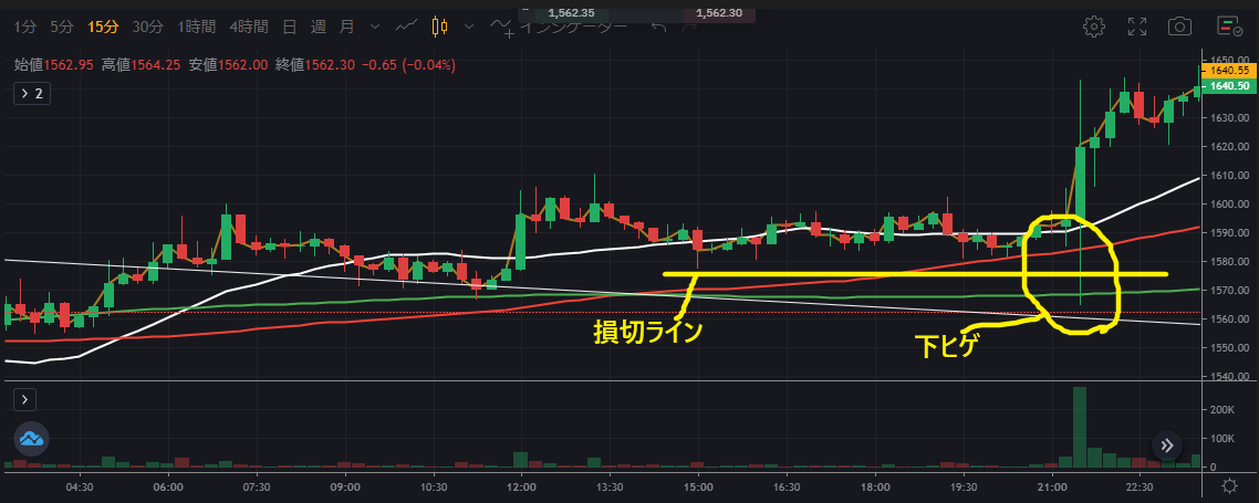 大きな下ヒゲを付けてしまったため損切となっていますが