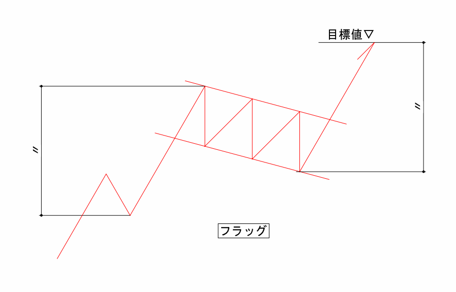 上昇中に現れる形で右に下がっていくのが上昇フラッグ