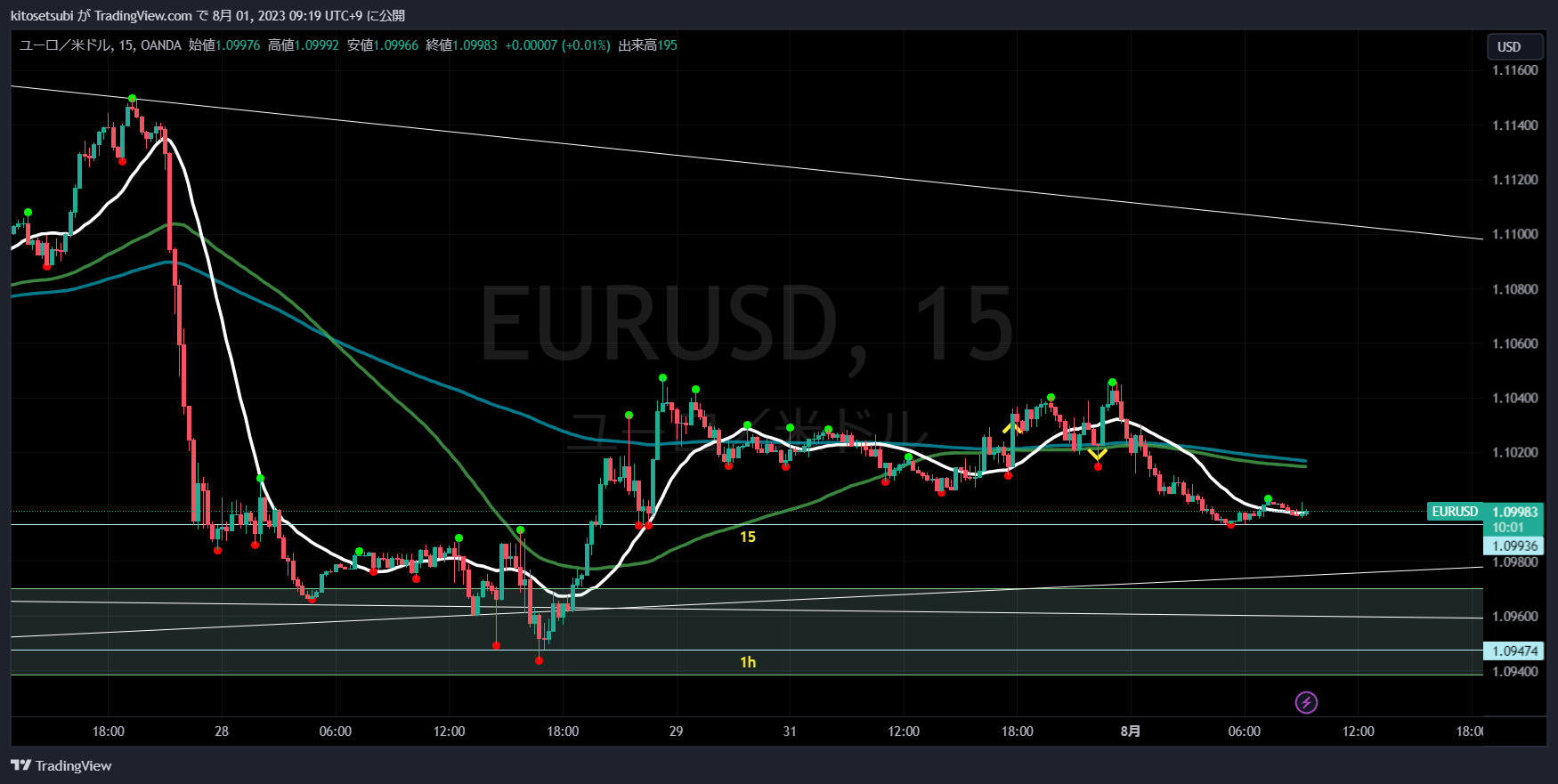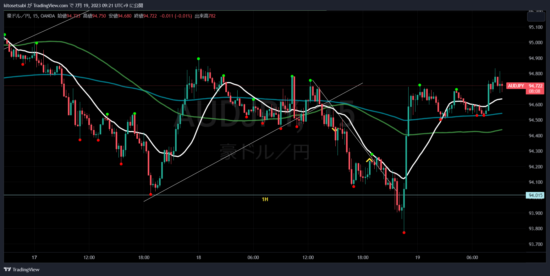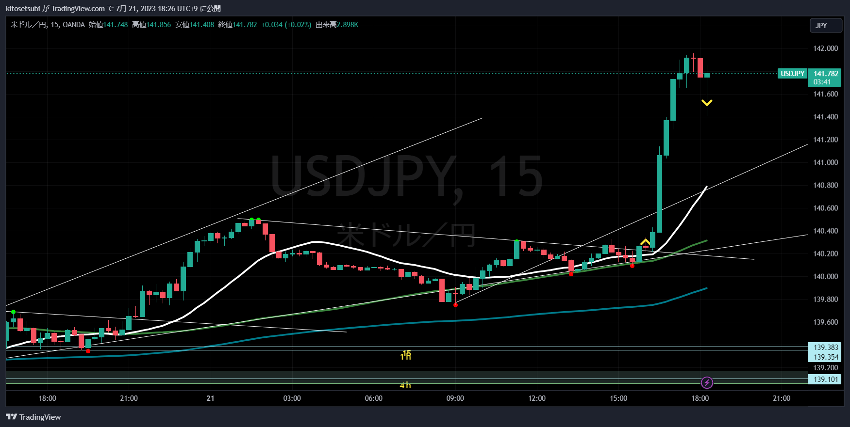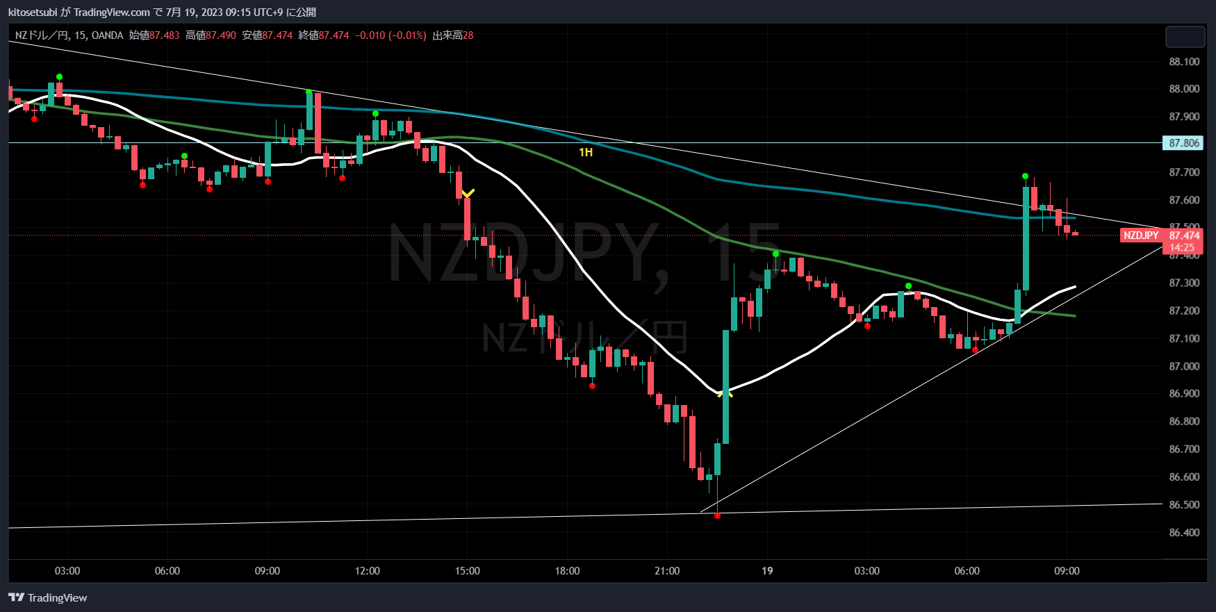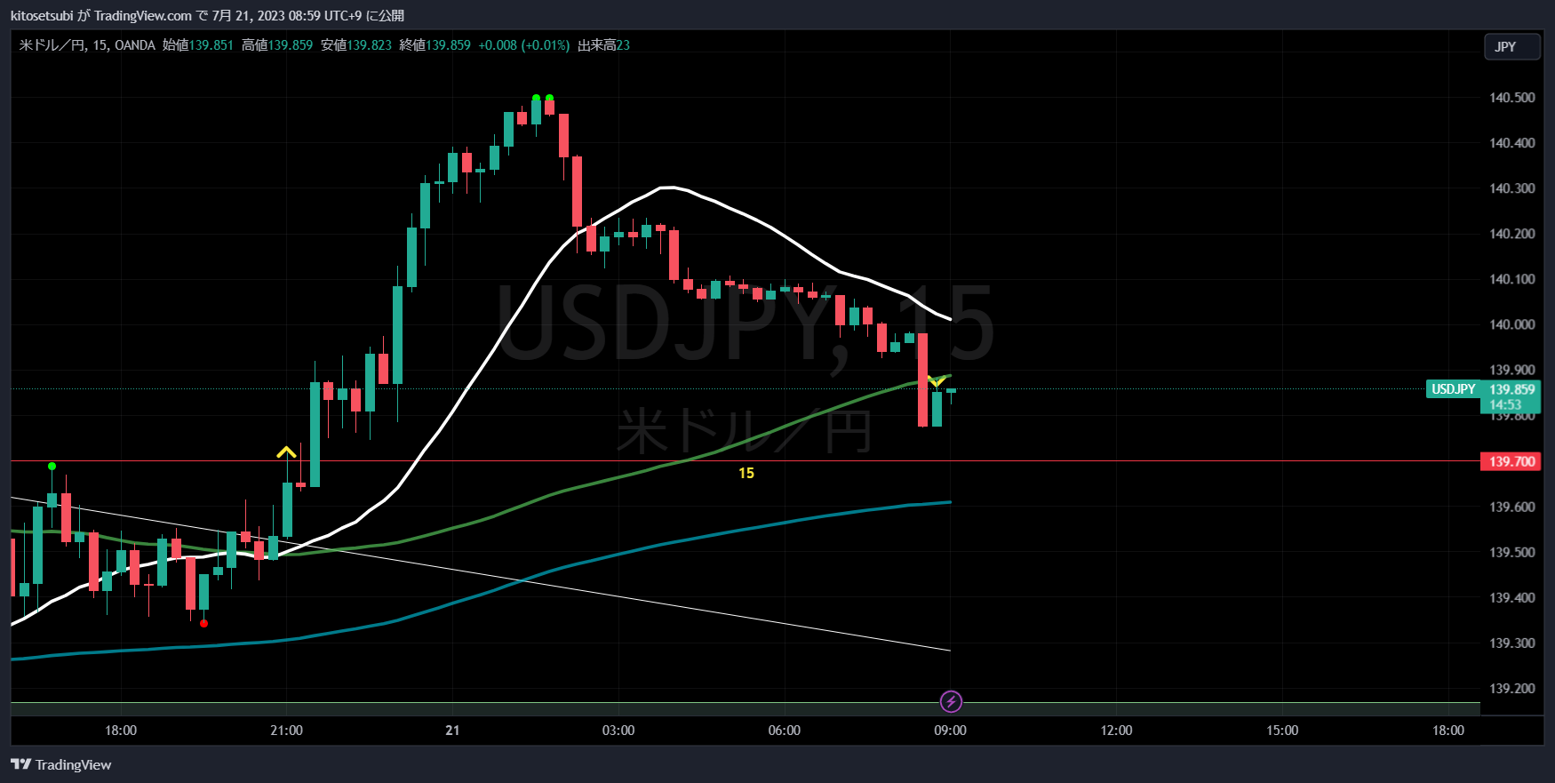 15分足大きな陰線をつけたので少し反発した所で利確しています