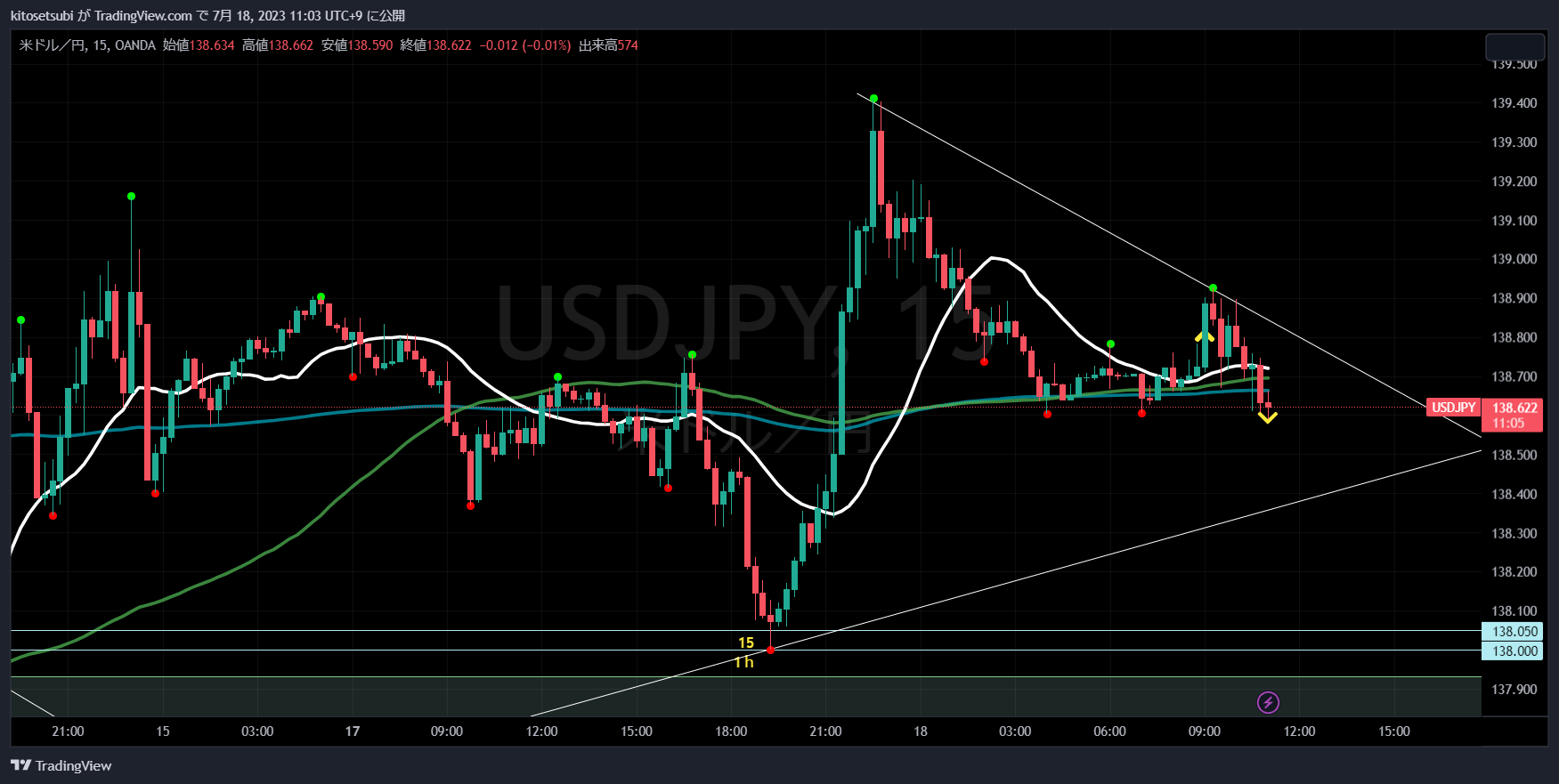 15分足大きく上昇して押し目をつけず上がっていったので大きく下げてくる可能性が高かった