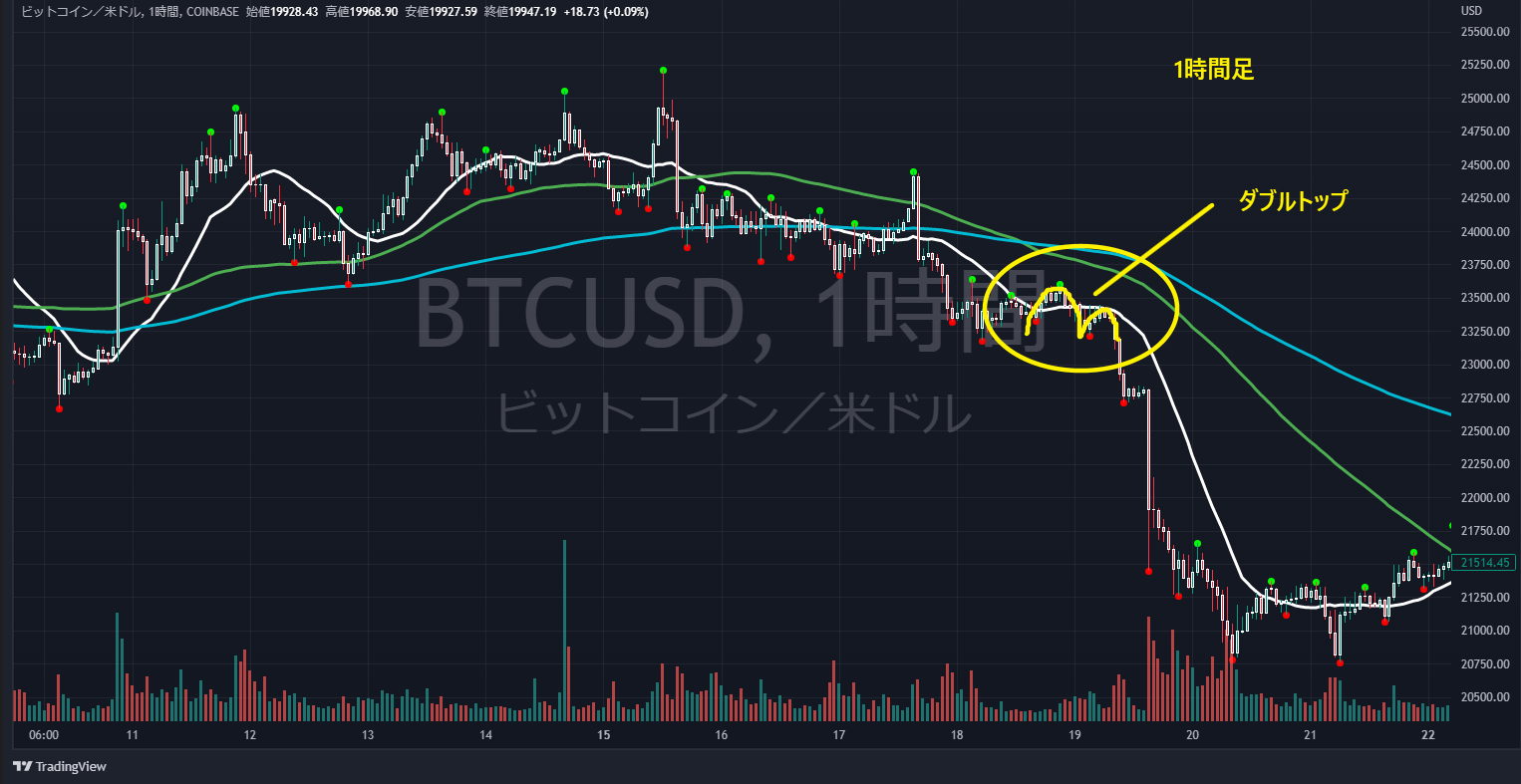 黄色で書いてあるのが1時間足でのWトップです