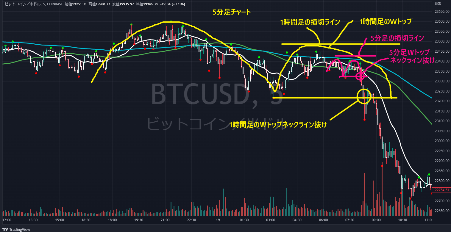 今回のチャートのWトップ(赤色)を5分足でエントリーした後に