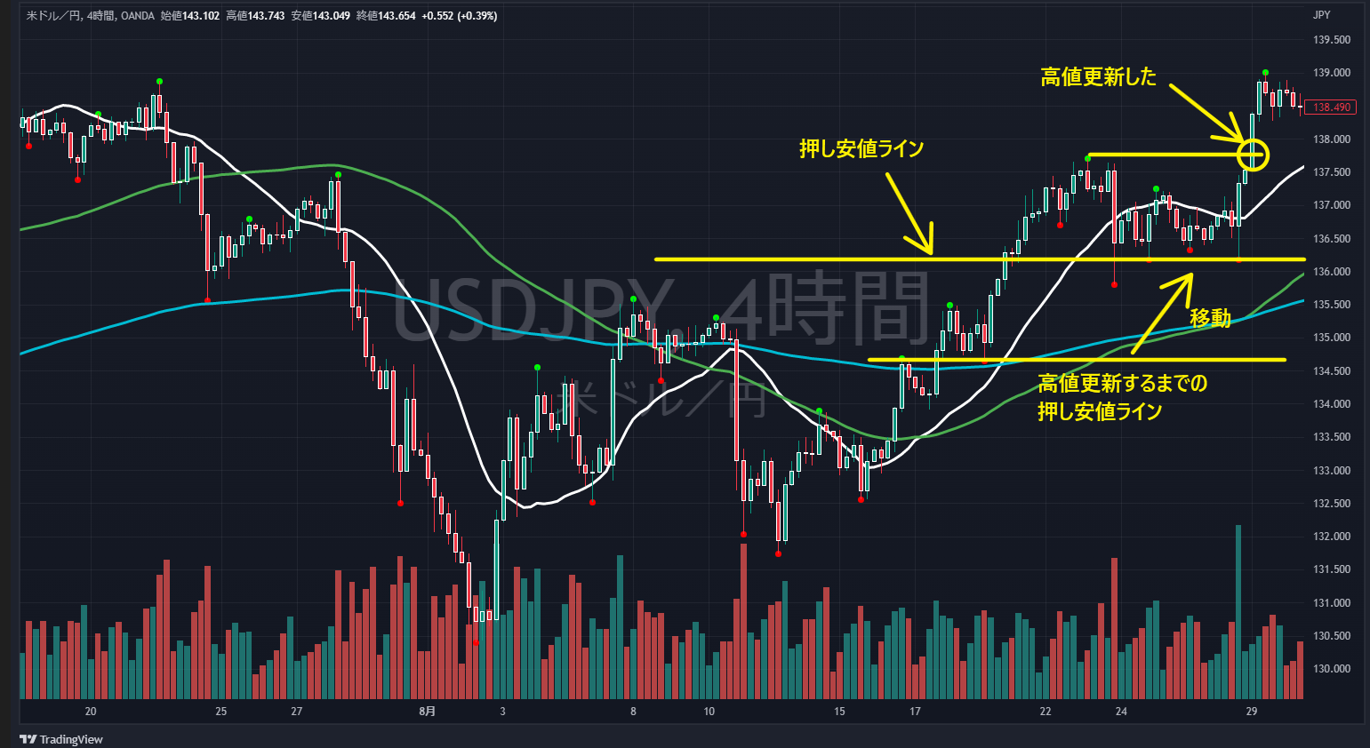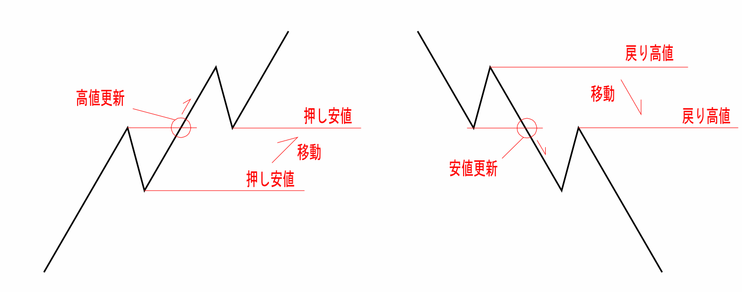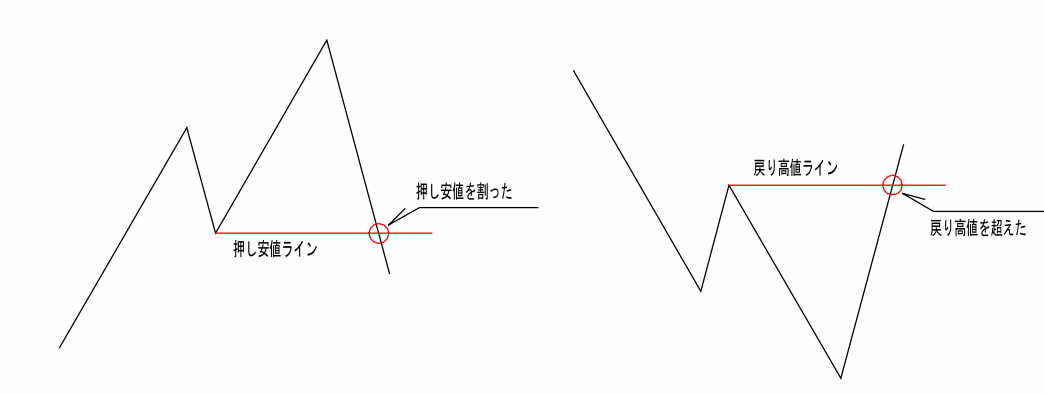 図のように押し安値を割った時点で上昇トレンドが下落トレンドへ転換したとみます